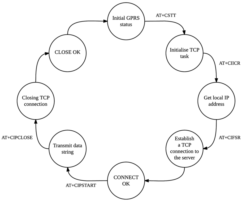 (2) GPS and GSM module: The GPS module contained an integrated GSM module as well. This allowed for the use of only one serial communication channel between the control unit and the module. Through this channel, both GPS and GSM functionalities could be accessed. Attention (AT) commands are used to facilitate communication with the module. The module itself required a separate supply voltage of 4 V and as mentioned above, a separate LiPo battery is incorporated to provide the necessary power. The module contains two receiver antennas: one antenna serves the purpose of receiving GPS signals, and the other antenna allows for an uplink to the GSM network. MTN South Africa is considered to be the service provider of choice. Table 2 below gives an overview of the AT commands that are used in software for general module communication. All AT commands are stored on the microcontroller and this therefore allowed the control unit to have full control over the module.
