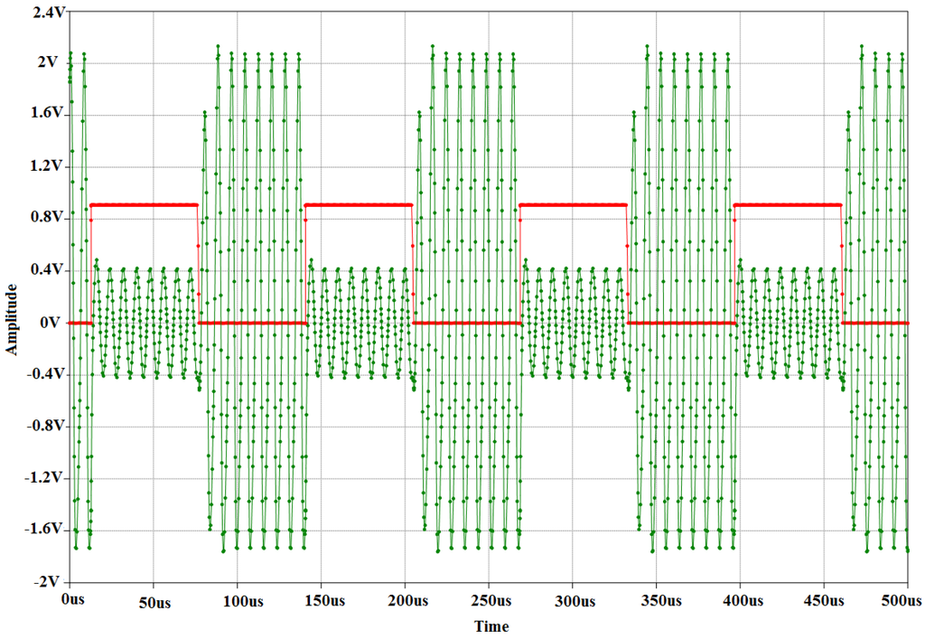 - Transponder load modulation circuitry: The next phase in the design process is to design, simulate, and implement the load modulation circuit. The purpose of the load modulation circuit is to manipulate the RF-field between the reader and transponder, in order to transmit data from the transponder to the reader. The load modulator consists of a resistor and a switch. The resistor is directly connected to the LC tank. The purpose of the switch is to connect or disconnect the resistor to or from the antenna. By doing so, the parameters of the transponder resonant circuit are changed, which results in variations in the magnitude and phase of the transponder impedance (modulation). The variations can be detected by the reader through the RF-field, and by applying an appropriate procedure, the reader can reconstruct (demodulate) the transmitted data. The switch is implemented with the use of a FET, due to the fact that FETs are used in the construction and fabrication of logic switches in the field of microelectronics. A PIC microcontroller is used as the data carrier, and the transmission pin of the data carrier is directly connected to the gate of the FET. This allows the data carrier to have full control over the modulation. The source of the FET is connected to the resistor which, in turn, is connected to one of the resonant circuit terminals. Figure 6 shows the simulation model for the load modulator. A simple clock divider circuit is implemented in order to simplify the simulation of load modulation. The purpose of the clock divider is to simulate the real-time transmission of data from the microcontroller. The EM4100 RFID communication protocol has been implemented on the transponder. This implies that data bits are transmitted at a rate of 2 kHz. In the simulation, a sine wave generator is used to simulate the induced voltage in the resonant circuit. The resonant circuit is represented by an inductor and capacitor. The load modulator is connected to the resonant circuit and receives a square wave input from the clock divider. Figure 6 shows the transient analysis of the load modulator simulation.