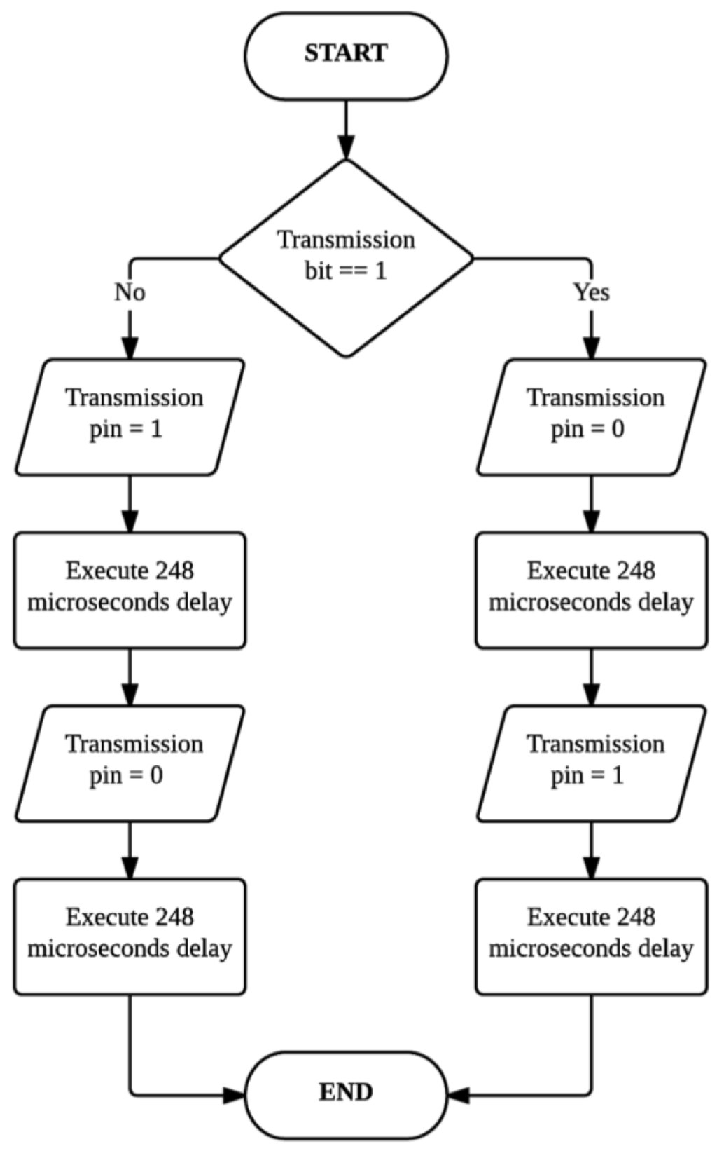 If a binary one needs to be transmitted, the output pin of the microcontroller will output a binary zero for 248 microseconds and a binary one for another 248 microseconds. This results in a transmission rate of 2.015 kHz (496 μs). Figure 7 shows the Manchester encoding subroutines that are implemented.