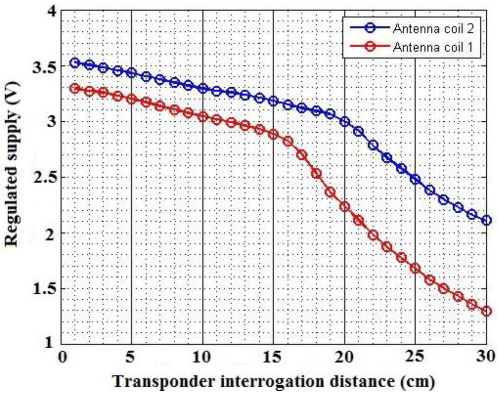 In order to measure the power levels of the transponder, two boxes are used as antenna mounts. The reader antenna is mounted to one box in an upright position, and the transponder antenna is mounted to a second box, also in an upright position. This allowed for the two antennas to be oriented in parallel, which allowed for maximum power transfer. The performance of the regulated power supply for the RFID transponder can be viewed in Figure 10. The result shows the regulation of a stable DC power supply. The configuration of the LC tank allows for adjustments to be made. Since the inductance values did not match perfectly, the capacitor values are adjusted with the use of Equation (3). The operating frequency of the reader is therefore still matched in order to achieve optimal resonance on the transponder side. From Figure 10, it can be seen that the voltage regulator circuit, together with the rectifier circuit, performed as expected. The voltage is successfully limited when the range between the transponder and reader is decreased. An exponential increase is limited to a linear increase in voltage.