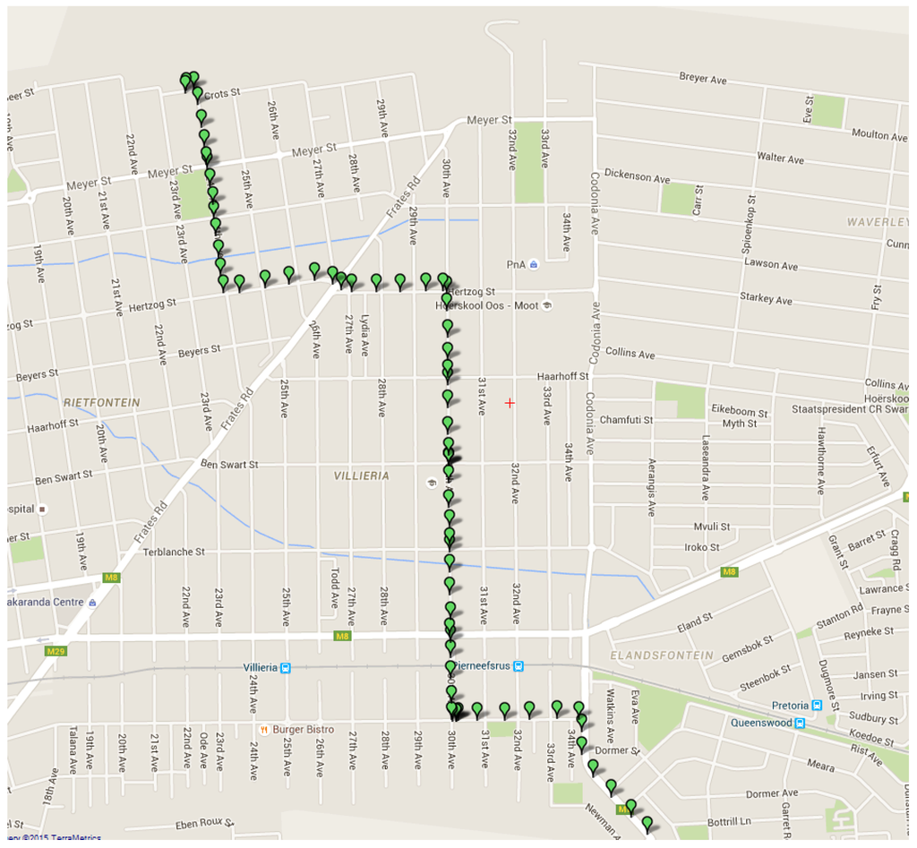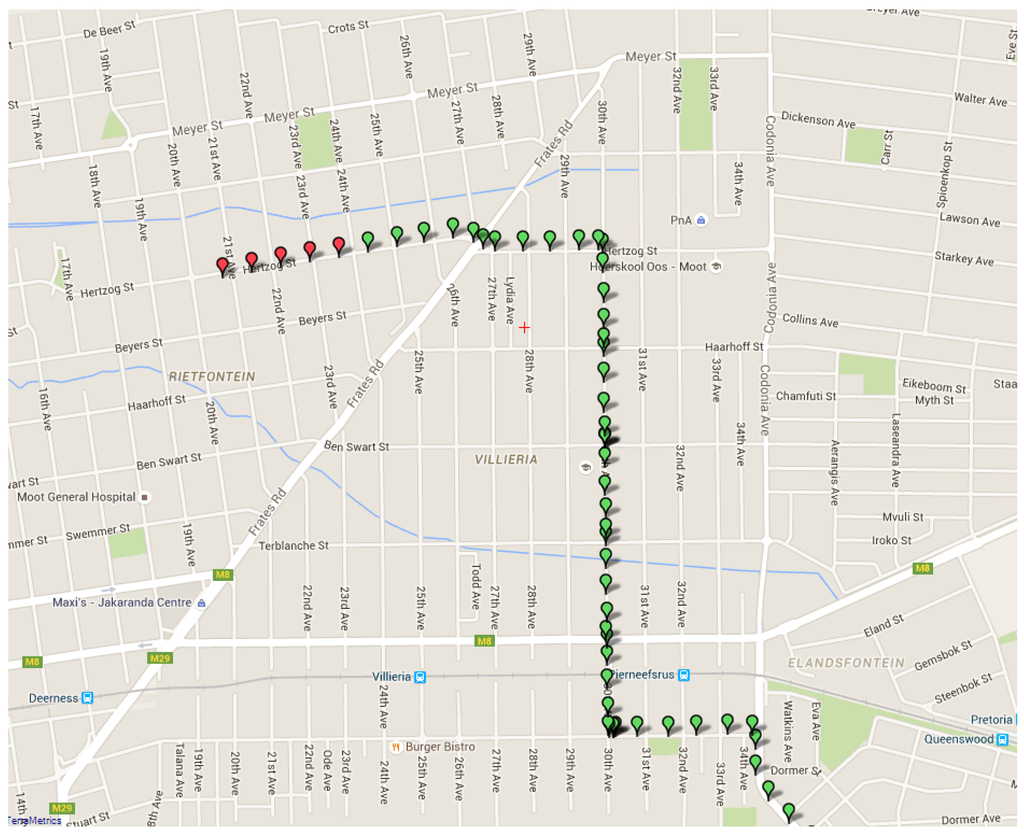 Figure 11 below shows the user interface and how location data is displayed. The location data is retrieved from the database system and processed on the interface side. From Figure 11 it can be seen that vehicle location data is successfully obtained and stored in the cloud. The data, which is represented by green markers, is also accurately displayed on the Google Maps interface. The estimation algorithm also has the ability to give straight-line vehicle positions, based on the location history of the vehicle. This can be viewed in Figure 12 (red markers are used for the estimation data). One observation that can be made from Figure 11, which is the fact that discrete data points are displayed. This is because location data is first retrieved and then transmitted via the GSM network to the database system. The transmission phase is first completed before new data is acquired. The estimation algorithm only has the ability to perform straight-line predictions in the case where the GPS module is switched off. This is because the system does not make use of any external sensors, such as an accelerometer, in order to determine if a vehicle has changed course or speed. Only the history of the vehicle position is used, which implies that a future change of direction cannot be predicted.