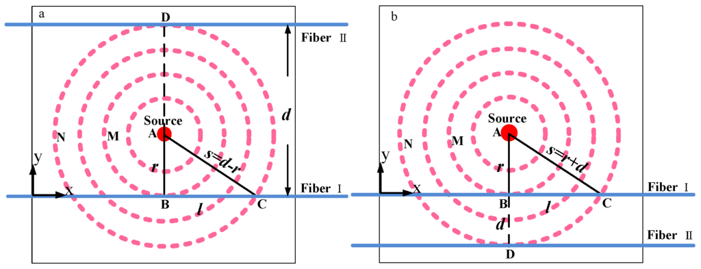 The two-dimensional fire source localization and geometrical arrangement of the optical fiber are shown in Figure 2, which is the top view of Figure 1, for two different configurations. The closed rings represent wavefronts of the hot gases, and each ring means a wavefront with identical temperature. Point A is the fire source location. The wavefronts M and N represent two different radii of the circular wavefront. Two sections of the optical fibers are placed parallel within the temperature field, crossing with different radii of wavefronts. The points B and D are the points of tangency between the fibers and the corresponding wavefronts. The assumption is made that the fire source is small enough so that it can be seen as a point fire source. Then the points with maximum temperature measured along the fibers are points B and D, respectively, and the smaller the radius, the higher the temperature. The position of the high temperature point can be determined by using OTDR, which is the abscissa of the fire source.