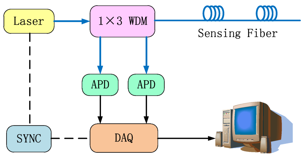 The schematic drawing of the DTS system is presented in Figure 3. The short pulse of light from a pulsed fiber laser operating at 1550 nm with a maximum peak power of 30 W, 10 ns pulse width and 10 kHz repetition rate is injected into the optical sensing fiber through a 1 × 3 wavelength division multiplexer (WDM). Raman scattering occurs in the optical sensing fiber, and the backscattered Raman Stokes as well as the Raman anti-Stokes light passing through the WDM are injected into a high-performance InGaAs avalanche photodiode (APD). Using the APD, the Raman Stokes and anti-Stokes light are transformed into electrical signals. Then a high speed 100 MHz data acquisition card converts the analog signals to digital signals. Finally, the computer processes the digital signals and calculates the temperature data according to the theoretical analysis presented in Section 2.1.
