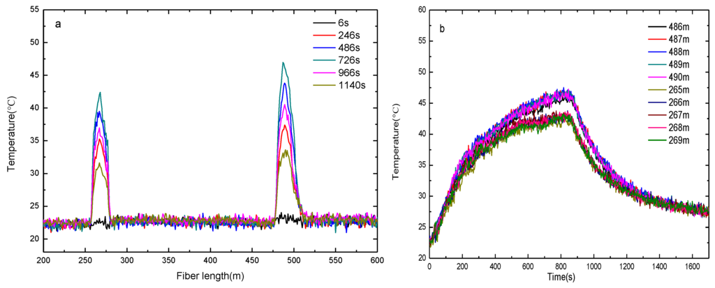 The measured temperature by the DTS system with fibers on same side of fire source: (a) Temperature versus fiber length at different burning times; (b) Temperature versus the fire burning time for different fiber lengths.