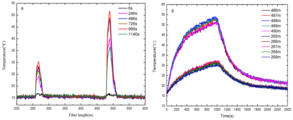 An optical fiber distributed temperature sensor (DTS) system is a kind of real-time and continuous monitoring space temperature field sensing technology [,]. The temperature profile can be derived based on the Raman backscattered light and the optical time-domain reflectometry (OTDR). The earliest example of distributed sensing with OTDR we could find is attributable to Dakin et al. []. A conventional optical fiber was used as the sensing element and the distributed sensor achieved a good spatial resolution of 3 m with sensor lengths up to 1 km. Numerous studies have been performed with the DTS, and a sensing distance >10 km has been achieved based on Raman backscattering []. The DTS has been widely used in many areas due to its unique advantages, such as immunity to electromagnetic fields, easiness of installing wire, remote distributed measurement compared with the conventional temperature sensors [,,,,]. With an optical fiber as the sensing element, the DTS can realize temperature monitoring with long-distance and wide range, which solves the deficiency of the sensor arrays.