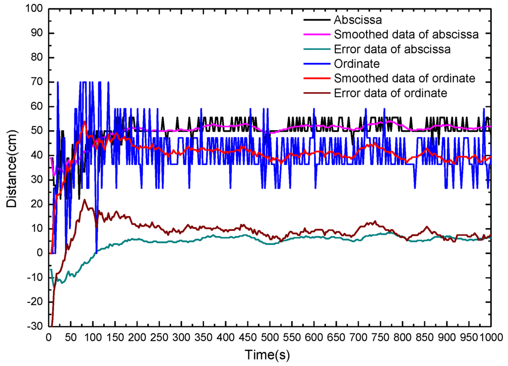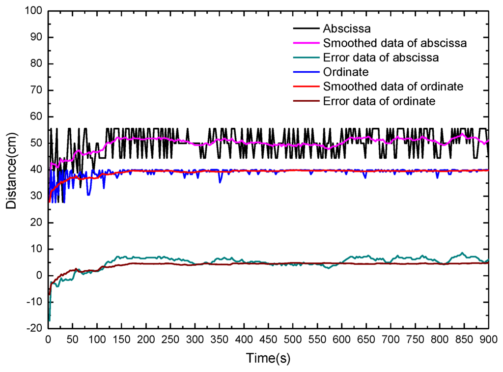 The calculated fire source location and the location errors with fibers on the same side of fire source in dependence of the alcohol burning time is shown in Figure 8. The calculated ordinate y fluctuates intensely at the beginning of the fire, and gradually stabilizes after 3 min. According to the experimental conditions, thresholds of abscissa and ordinate are set as (0, 100) and (0, 70), respectively. If the calculated values are beyond the scope of the threshold value, the threshold value of minimum and maximum are used instead of the values below or above the threshold, respectively. The fluctuations are reduced evidently after the data are smoothed.