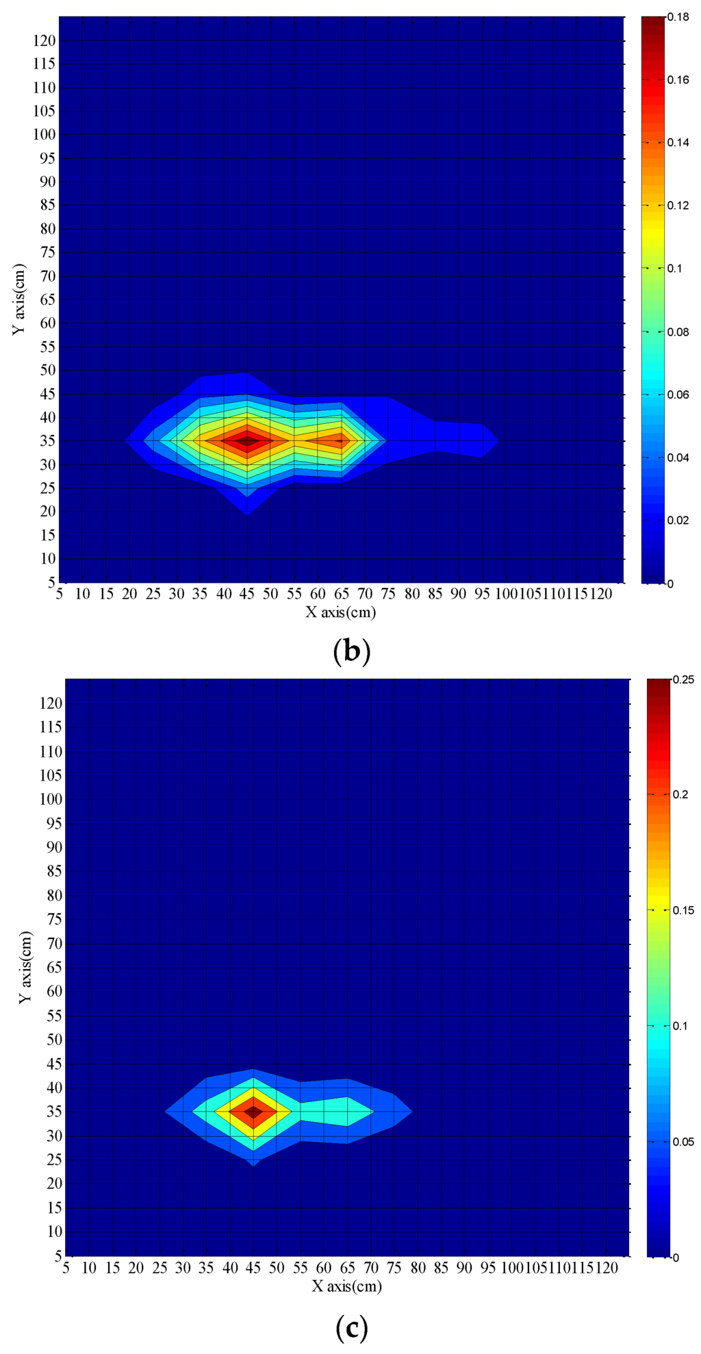 Figure 10 shows results after 70 s, 80 s, and 180 s fire burning time when the fibers are placed on the same side of the fire source. The center position of the actual fire source is (45.5 cm, 32 cm). As mentioned above, the fluctuations of the calculated fire source location in Figure 7 are different from those in Figure 8, thus the shape and range of the fire source in Figure 9 are quite different from that in Figure 10.