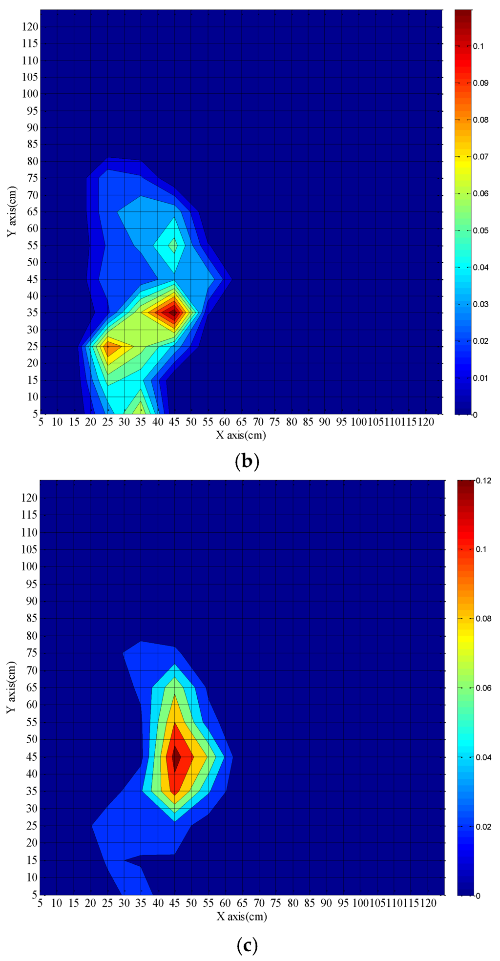 The fire source location is preliminarily confirmed when the burning time is 70 s, and the actual fire source is covered completely within the calculated fire source. The position of the fire source is finally determined at a burning time of 180 s, which is consistent with the previous discussions. The time of 40 s for a rough determination of a fire source position is considerably shorter than the 90 s reported in [] and the location error of the proposed method is much smaller than that achieved with sensor arrays [,,].