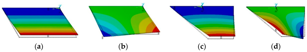 The resonant modes of different micro-cantilevers were obtained by fluid-solid coupling simulation in n-pentane, as shown in Figure 3, the resonant modes in other fluids were also obtained using the same method. The first order mode was the first order flexural vibration, and the second order mode was the first order torsional vibration in all different fluids. Figure 3a,b showed that the vibrating shapes of the rectangular micro-cantilever under the first and second order modes, respectively. Figure 3c,d reveal the vibrating shapes of the trapezoidal microcantilever under the first and second order modes, respectively. Thus, it could be seen that the vibrating shapes of the microcantilever obviously has nothing to do with the fluid environment, but are mainly related to the microcantilever structure (the length-width ratio).
