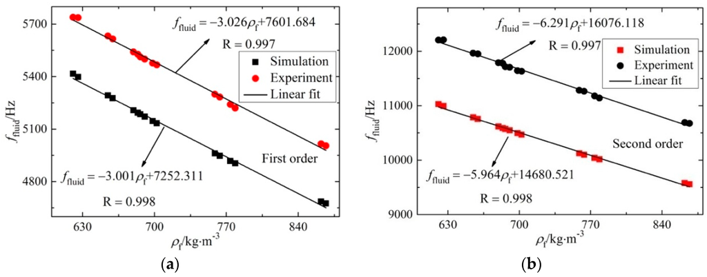In addition, it’s shown that the slopes of the fitting straight lines under the second order mode were larger than those under the first order mode. This means the variation of resonant frequency under higher order mode was larger with the same fluid density fluctuation. Thus, the sensitivity of fluid density measurement was higher under the second order mode than that under the first order mode. The density sensitivity under the second order mode in this paper was about 2 times larger than that with the value of −2.6 Hz·(kg·m−3)−1 in [].