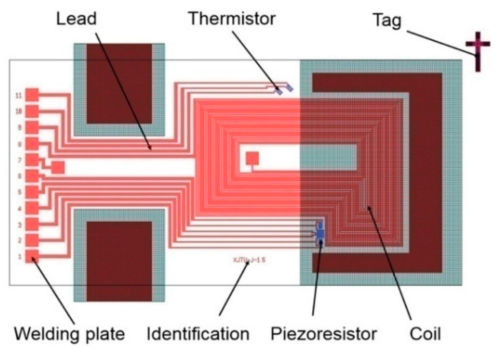 The sensing chip with the rectangular microcantilever was taken as an example to demonstrate the layout in Figure 6, where its dimensions were the same as in the simulation model. In the layout, there is a metal coil, four piezoresistors constituting the Wheatstone bridge, thermistor, identification tags, inner leads and welding pads. The sensing chip was fabricated using MEMS technology []. The microcantilever chip was excited to vibrate by the Lorentz force which was generated by the alternating current through the metal coil in the magnetic field. When the frequency of the alternating current was equal to the resonant frequency of the microcantilever chip, resonance would happen and the vibrating amplitude achieved its peak value. The amplitude data were obtained by the output of the Wheatstone bridge for the resistance values of piezoresistors were changed correspondingly. These data were fitted by the curves to calculate the resonant frequency and quality factor of the microcantilever chip. A thermistor was used to provide a reference temperature.