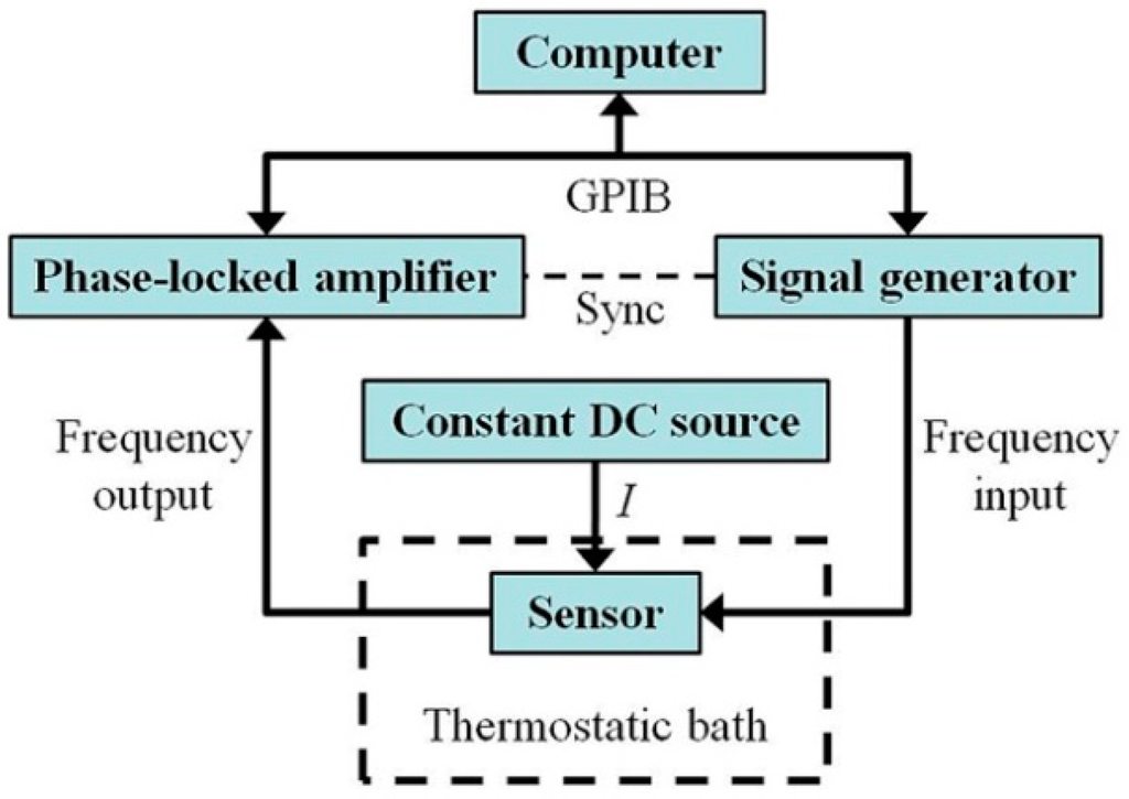 The schematic diagram and object diagram of the experimental system are shown in Figure 7 and Figure 8. The resonant sensor was packaged with the developed sensing chip. The external magnetic field was provided by a samarium cobalt permanent magnet with a strength of 0.28T. The magnetic field direction was parallel to length direction of the microcantilever chip. A signal generator (33220 A Agilent, Santa Clara, CA, USA) provided a sinusoidal AC voltage with suitable amplitude and frequency to power the metal coil of the sensing chip. At the same time, it also provided a sync reference voltage signal to the phase-locked amplifier (SR830, Stanford, Sunnyvale, CA, USA). The first and second order modes were both realized by increasing the frequency of exciting signal (AC voltage through the coil) to be the first and second order resonant frequencies of the micro-cantilever. The Wheatstone bridge was powered by a constant current source with a value of 2 mA, and its output signal was detected by the Stanford SR830 to determine the vibration mode. The coupling of the AC voltage to the resistors of the Wheatstone bridge could be ignored because the resistors were located near the fixed end of the micro-cantilever and their displacements were very small. The signal generator and phase-locked amplifier were both controlled by a computer through the general purpose interface bus (GPIB) lines. The environment temperature was kept with different constant values by a thermostatic (7008, Fluke, Everett, WA, USA).