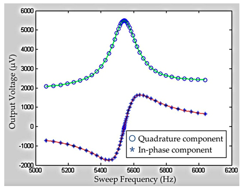 The resonant frequency and half peak width should be obtained to calculate the fluid density and viscosity using Equations (11) and (14). The Stanford S830 detected the output signals of the Wheatstone bridge when the sinusoidal AC voltage excited the metal coil from low frequency to high frequency. The signal amplitude of the Wheatstone bridge could be intensified when the input frequency of AC voltage was close to the resonant frequency of the micro-cantilever chip in the fluid. The obtained data of the amplitude versus the sweeping frequency are shown in Figure 9. The data in blue * were the in-phase component of voltage amplitude, and the data in blue ○ were the quadrature component of voltage amplitude. All data were fitted by the MATLAB software to obtain the fitting equation. Then the resonant frequency, amplitude and half peak width of the resonant sensor could be calculated based on this equation.