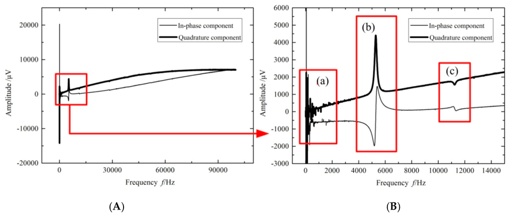 For the rectangular microcantilever chip, a frequency swept curve was obtained in 0.65 cs silicone oil under different resonant modes, as shown in Figure 10. There were many irregular peaks in the curve below 2 kHz as shown in Figure 10Ba because the microcantilever chip was easily disturbed by external vibration and noise.