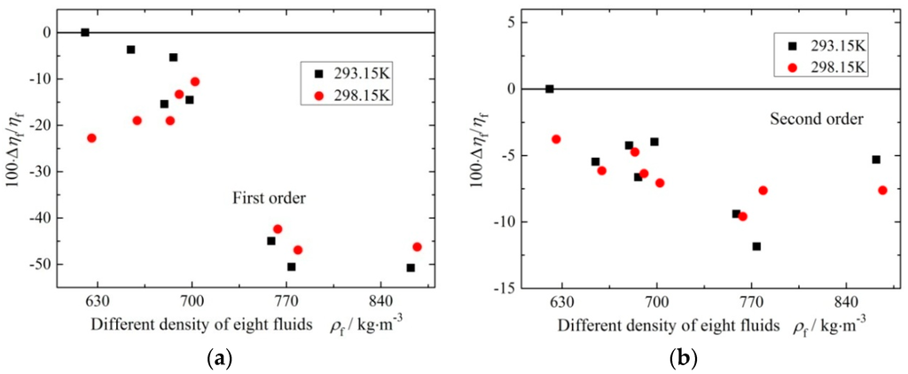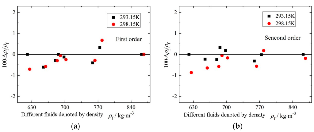 In order to test the sensor’s performance, different fluids with various densities and viscosities should be measured by the proposed sensor. The measured fluids included n-pentane, n-hexane, n-heptane, isooctane, n-octane, 0.65 cs silicone oil, cyclohexane and methylbenzene. A specific fluids has different densities and viscosities under different temperatures. For the alkane fluids, their physical properties are the most stable from 20 °C to 25 °C. Their reference values of density, viscosity and sonic speed under standard atmospheric pressure and different temperature (293.15 K and 298.15 K) were calculated using the Reference Fluid Properties (REFPROP) software. In the field of thermophysical properties, the REFPROP software [,] is often used to provide the reference values of fluid density, viscosity, conductivity, and so on. Therefore, we used the reference values from the software to estimate the accuracy of each measurement.