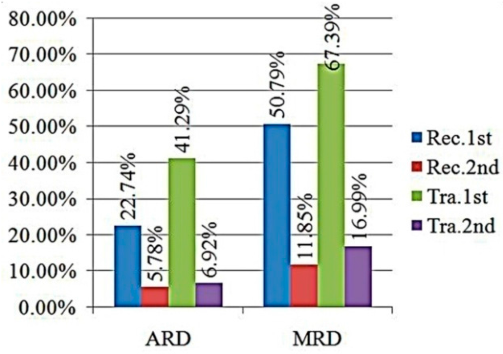 In order to describe and evaluate the measurement results of fluid density and viscosity, the average relative deviation (ARD) and maximum relative deviation (MRD) were introduced to analyze the measurement accuracy. The ARD is the average relative errors of all corresponding measurement results of the eight fluids at two temperature points. The MRD is the maximum relative deviation of all corresponding measurement results of eight fluids as well. Figure 13 and Figure 14 showed measurement accuracies of density and viscosity in ARD and MRD under different resonant modes.