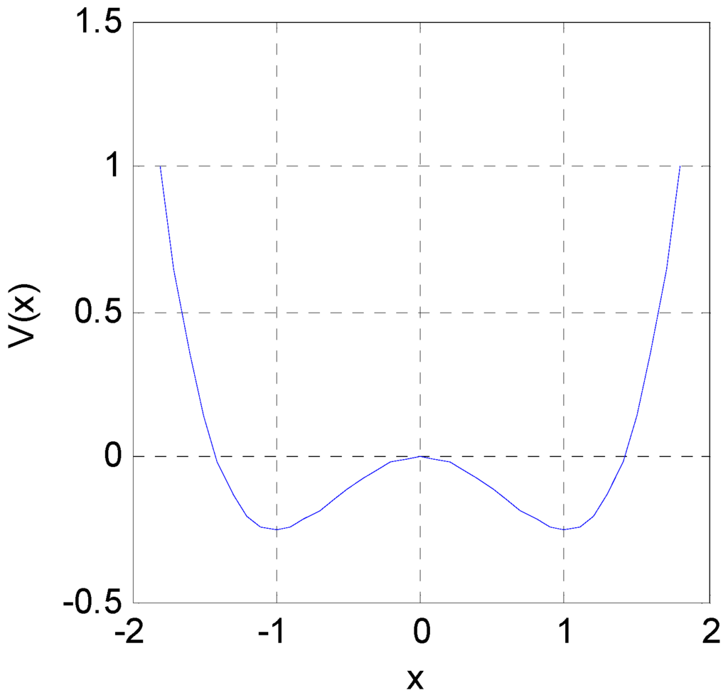 Potential function of a bistable system, showing that the motion can quickly converge to one of the two equilibrium points when the external force is missing.