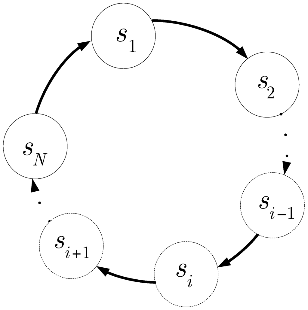 If the nonlinear oscillator is a unidirectionally coupled ring as shown in Figure 2, and the number of oscillators in the ring is N, the coupled bistable oscillator in the ring is expressed as follows: