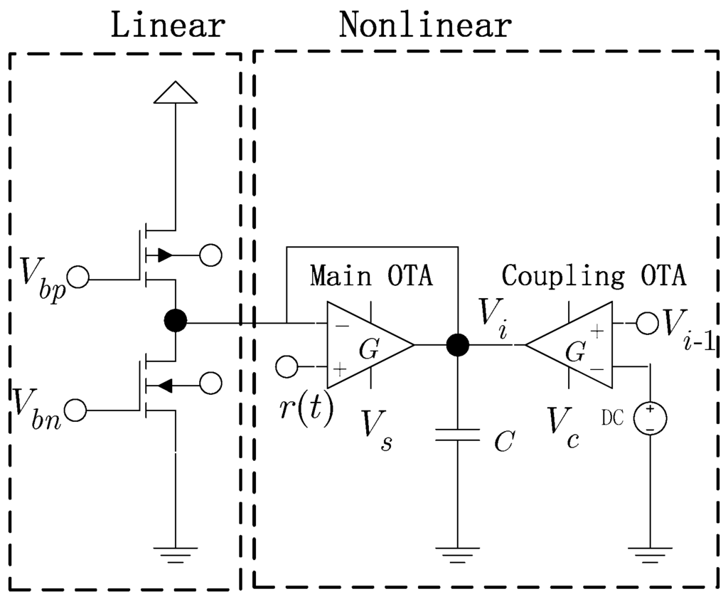 In order to form a ring as shown in Figure 2, the output of the previous element is coupled into the element by the coupling OTA shown in Figure 3, and the signal itself is coupled to the next element. The generation of the oscillation is related to N, the number of elements in the ring. When N has an even value, the system is in a stable state; the system is not stable when N has an odd value [25]. For the circuit shown in Figure 3, C, , , , and must be adjusted to the appropriate values to generate the periodic signal. Via Equation (6), is defined as the nonlinear coefficient representing the bistability of the circuit, and is the coupling coefficient among the nonlinear oscillators. and are constants during signal processing. Provided , , , , , , and , and substituting into the following system dynamics equations: