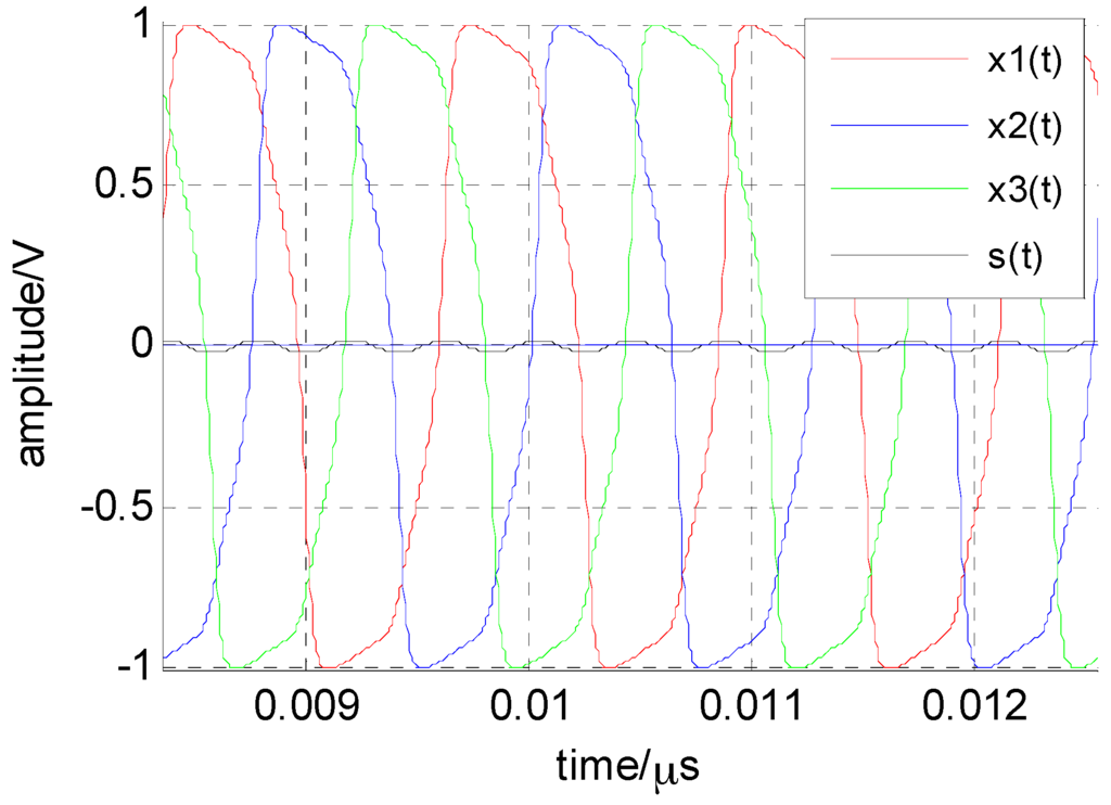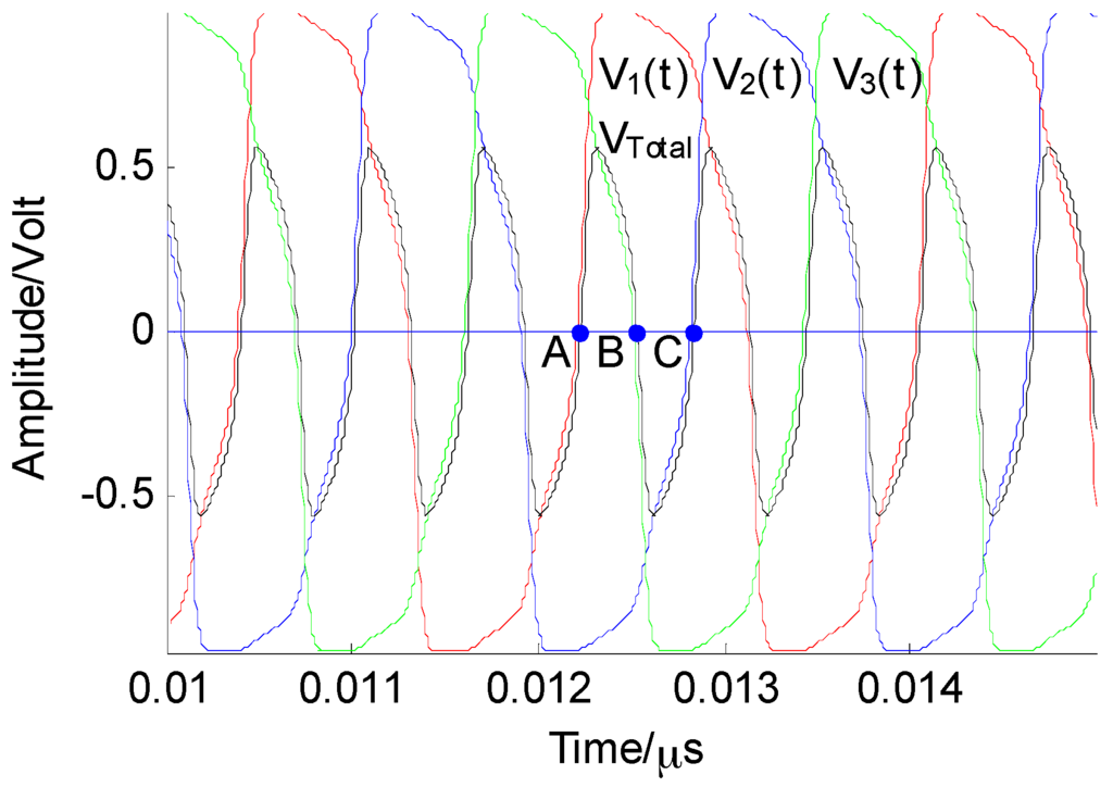 where , , , and . In the end, the period of the superposition of the three elements’ oscillation signal is . The corresponding frequency is