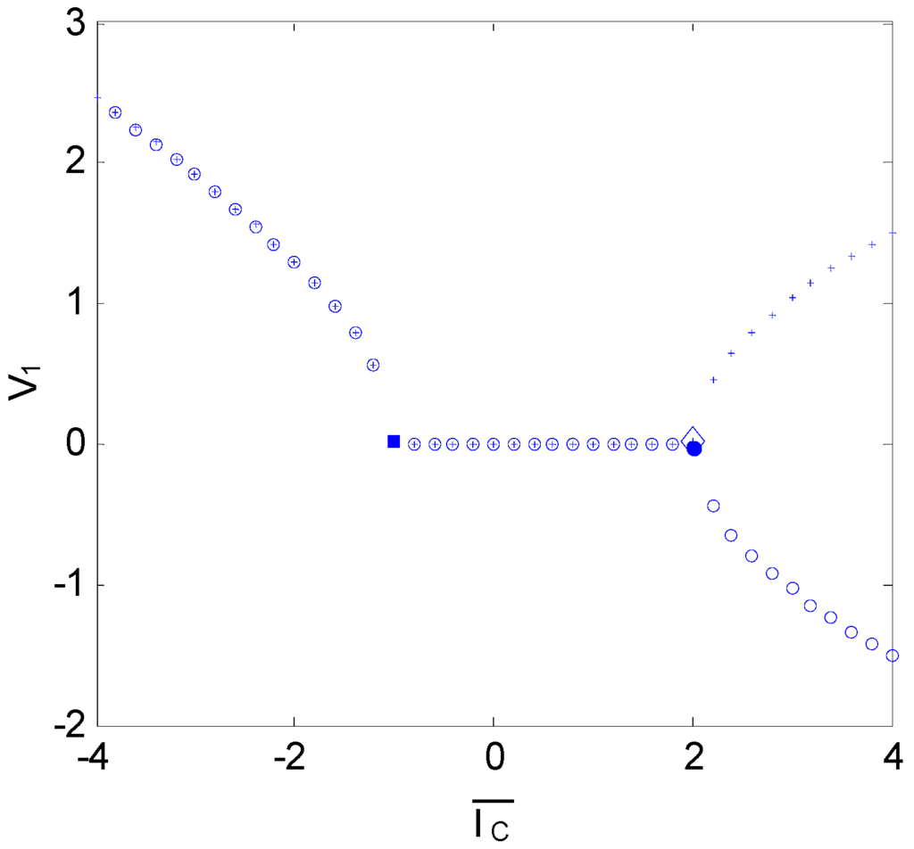 Bifurcation diagram of the system (, , ). Once the unstable bifurcation point is reached, the system begins to oscillate. Solid dots indicate the unstable bifurcation point.