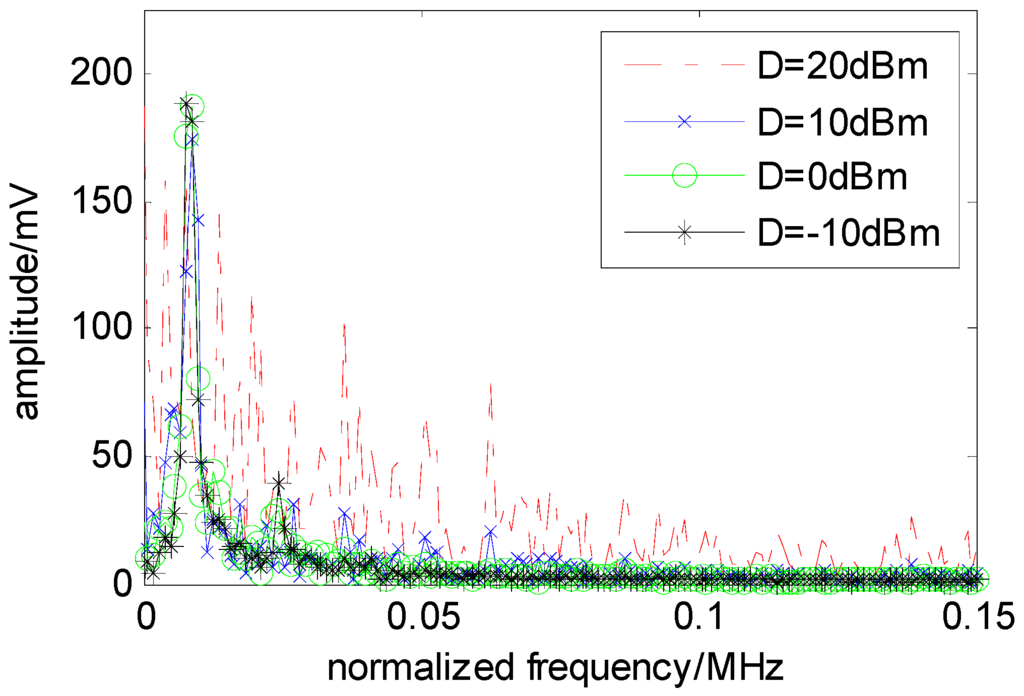 Through numerical simulation in MATLAB, the bifurcation characteristics of the system with Gaussian white noise are obtained under different noise variances. Table 1 lists the different critical coupling points for different noise variances and shows that the variation of the critical coupling point is minor when Gaussian white noise is fed into the system. Figure 7 shows the spectrum of the system oscillation waveform when the noise variances are 20, 10, 0, −10, −20 and −30 dBm. Except for the variance of 20 dBm, the frequency of the oscillation waveform is the same for all of the other cases.
