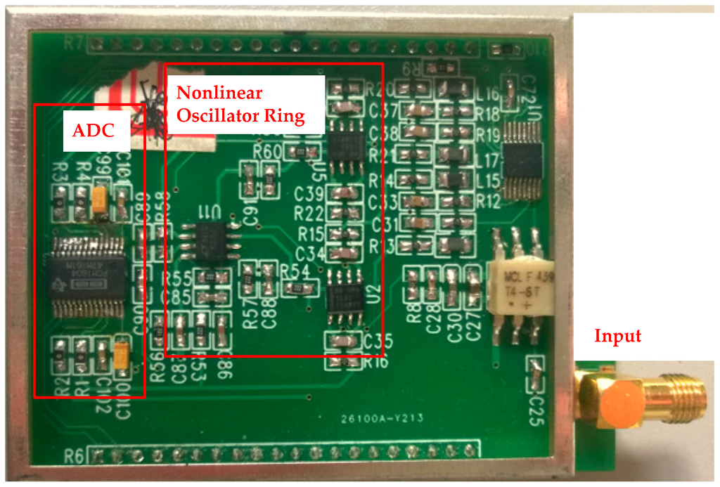 Based on the circuit and the structure of the unidirectionally coupled, overdamped nonlinear oscillator shown in Figure 2, we designed an experimental spectrum-sensing circuit composed of three elements. The circuit, which includes a nonlinear oscillator ring, and an ADC, is shown in Figure 10.