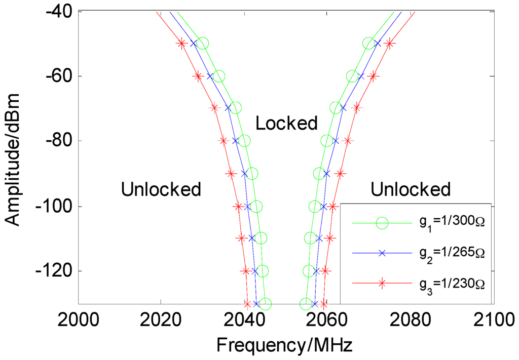 The setup for the spectrum-sensing experiment is shown in Figure 11. First, the critical point (ISC, ICC) is adjusted to make the circuit system work in the critical region of oscillation. Next, the signal generator is used to generate the RF signal that is fed to the circuit system. When the frequency of the signal falls into the spectrum-sensing range, the circuit system starts to oscillate; the frequency of the oscillation signal is 1/3 of the RF signal. As shown in Figure 12, by changing the intensity and frequency of the input signal, the relationship between the spectrum-sensing bandwidth and the amplitude of the input signal, or the conductivity, g, can be obtained by observing whether the circuit oscillates. In Figure 12, the region labeled “unlocked” is where the system is not synchronized to the external RF signal, while the region labeled “locked” is where the system is synchronized to the external RF signal.