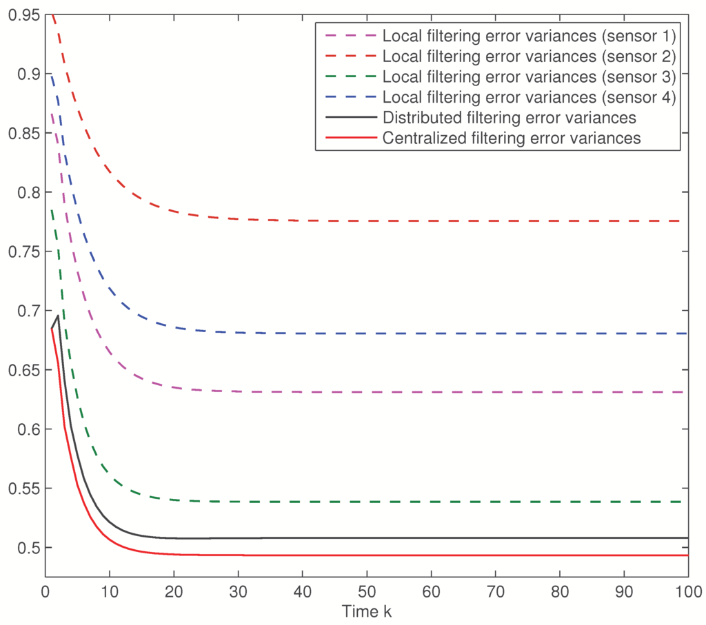 First, the error variances of the local, distributed and centralized filters will be compared considering the same delay probabilities for the four sensors. Figure 1 displays these error variances when , , which means that the delay probability at every sensor is . This figure shows that the error variances of the distributed fusion filtering estimator are lower than those of every local estimators, but slightly greater than those of the centralized one. However, this slight difference is compensated by the fact that the distributed fusion structure reduces the computational cost and has better robustness and fault tolerance. Analogous results are obtained for other values of . Actually, Figure 2 displays the distributed and centralized filtering error variances for , which lead to the delay probabilities , respectively. In this figure, both graphs (corresponding to the distributed and centralized fusion filters, respectively) show that the performance of the filters is poorer as increases. This fact was expected as the increase of yields a rise in the delay probabilities. This figure also confirms that both methods, distributed and centralized, have approximately the same accuracy, thus corroborating the previous results.