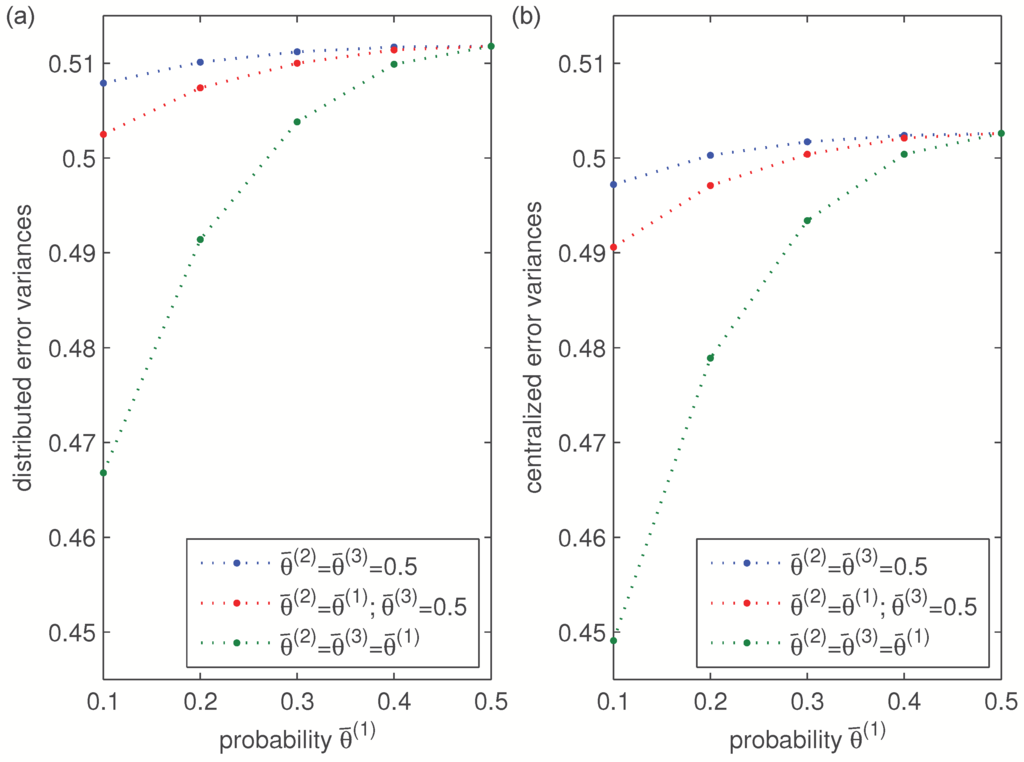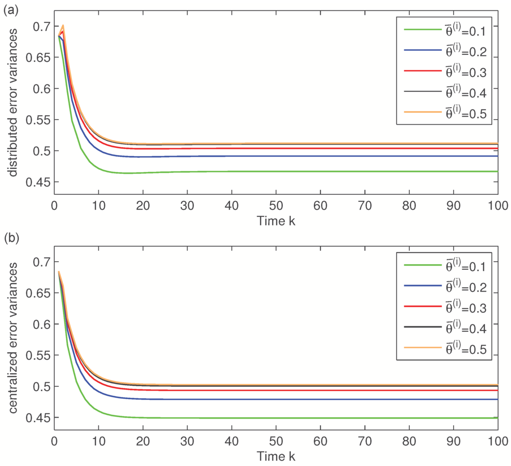 (a) Distributed filtering error variances and (b) centralized filtering error variances for different values of .