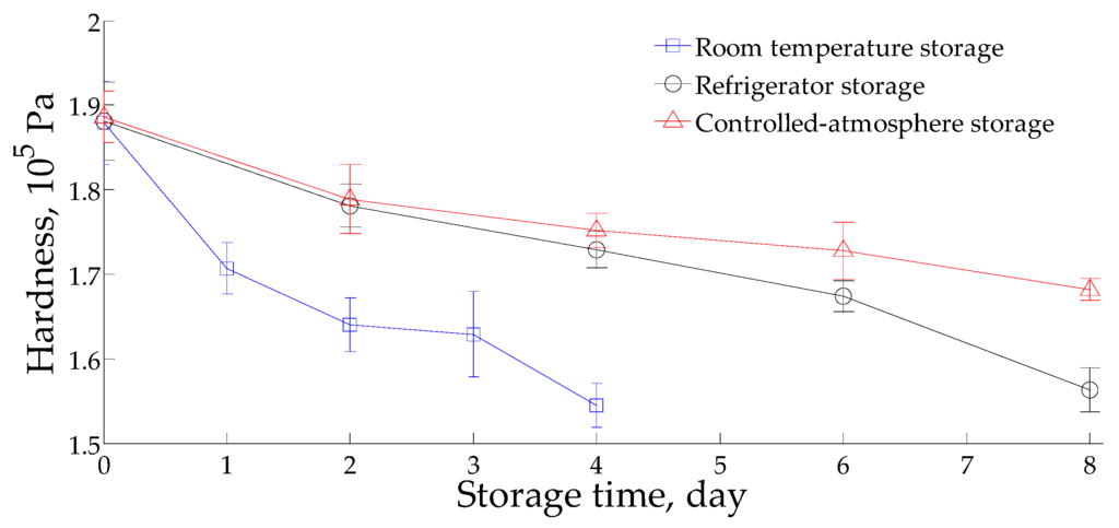- The hardness of litchi decreases with an increase in storage time. However, the decrease rate in order from fast to slow is room temperature, in a refrigerator environment and in a controlled-atmosphere environment.