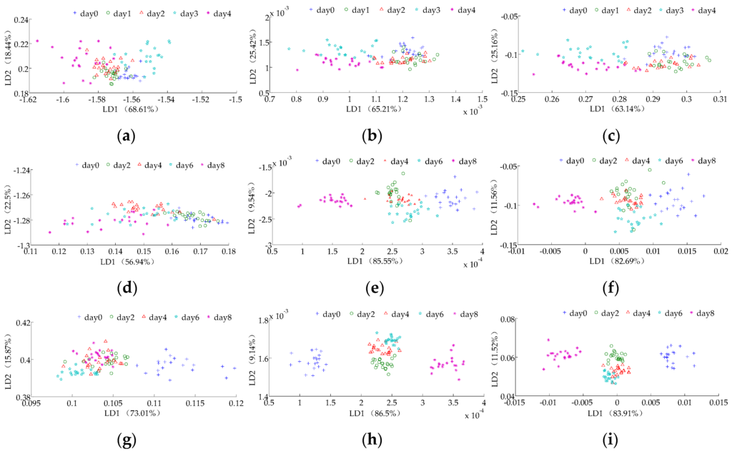 The LDA analysis results of the storage time for litchi stored in a refrigerator (from the 0th to the 8th day) based on the maximum values, the average of differential values and the 80th s values are shown in Figure 2d–f, respectively. When the maximum values were applied as the feature value for LDA analysis for the storage time for litchi stored in a refrigerator environment (Figure 2d), all storage times overlap with the others and cannot be classified. When the average of differential values was applied as the feature value for LDA analysis of the storage times for the litchies stored in the refrigerated environment (Figure 2e), none of the storage times can be classified, except those on the 0th and 5th day that were not overlapped by others. When the 80th s values were applied as the feature value for LDA analysis for the refrigerated environment storage group (Figure 2f), only the 0th and 5th day can be classified via this method. However, the 2nd, 4th, 6th and 8th day cannot be classified.