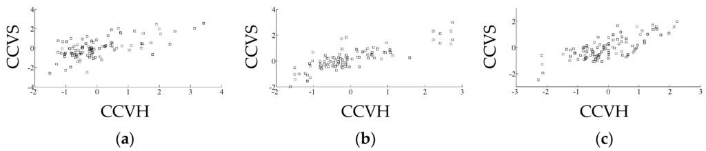 The CCA plot of electronic nose data and hardness of litchi stored in (a) the room temperature environment; (b) the refrigerator environment; and (c) the controlled-atmosphere environment. Note: The CCVS is the canonical correlation variable of the sensor response data, the CCVH is the canonical correlation variable of the hardness values.