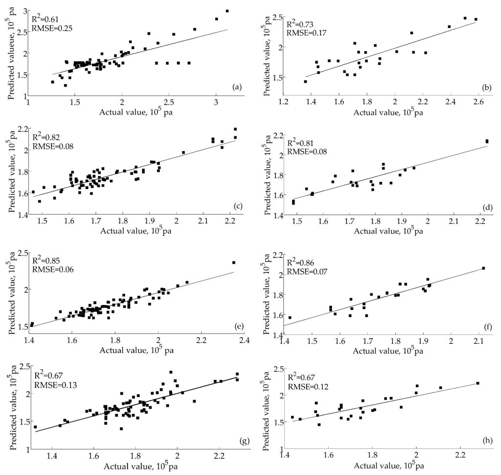 When PLSR is used for regression fitting, the fitting correlation coefficient (R2) and the root mean square error (RMSE) are two important indexes for judging the correlation effect. It is noted that according to [37], if the R2 value is greater than 0.8, this demonstrates that the prediction value has a high correlation with the actual value. If the R2 is closer or further from 1, the correlation is higher or lower, respectively. However, if the R2 is lower than 0.8, this demonstrates that the prediction value has a low correlation with the actual value and that the prediction is unfeasible. In addition, the closer the RSME value is to 0, the better the prediction effect. The BPNN-PLSR hardness prediction effects are illustrated in Figure 4.