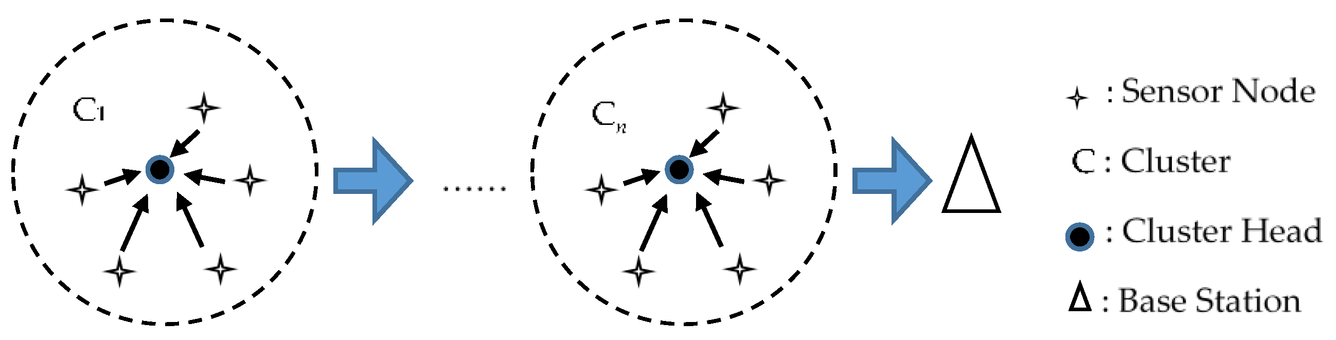 Figure 2 illustrates the topology of a clustered WSN. Coordinating cluster heads (CHs) control the topology where each CH guides a different cluster of sensor nodes. Such an architecture leads to a two-tier hierarchy where the upper tier comprises CHs and the lower tier comprises sensor nodes. Sensor nodes in specific regions transmit their sensed data to the responsible CH that manages the nodes. The responsible CH collects the data, which are transmitted to the single base station via other CHs. In this way, we can relate each cluster to a parallel system and each set of clusters to a serial system. Therefore, any route from a sensor node to the base station can be naturally regarded as a serial-parallel path. Since there are various routes through which sensed data can be transferred, a clustered WSN can be mapped correspondingly to a parallel-serial-parallel system where each sensor node fails independently. Each cluster operates if at least one of its sensor nodes works normally. However, for any route, all of its clusters must work normally for proper operation. As a result, we can evaluate the reliability of a clustered WSN based on the MTTF of a sensor node from the perspective of classical reliability theory.