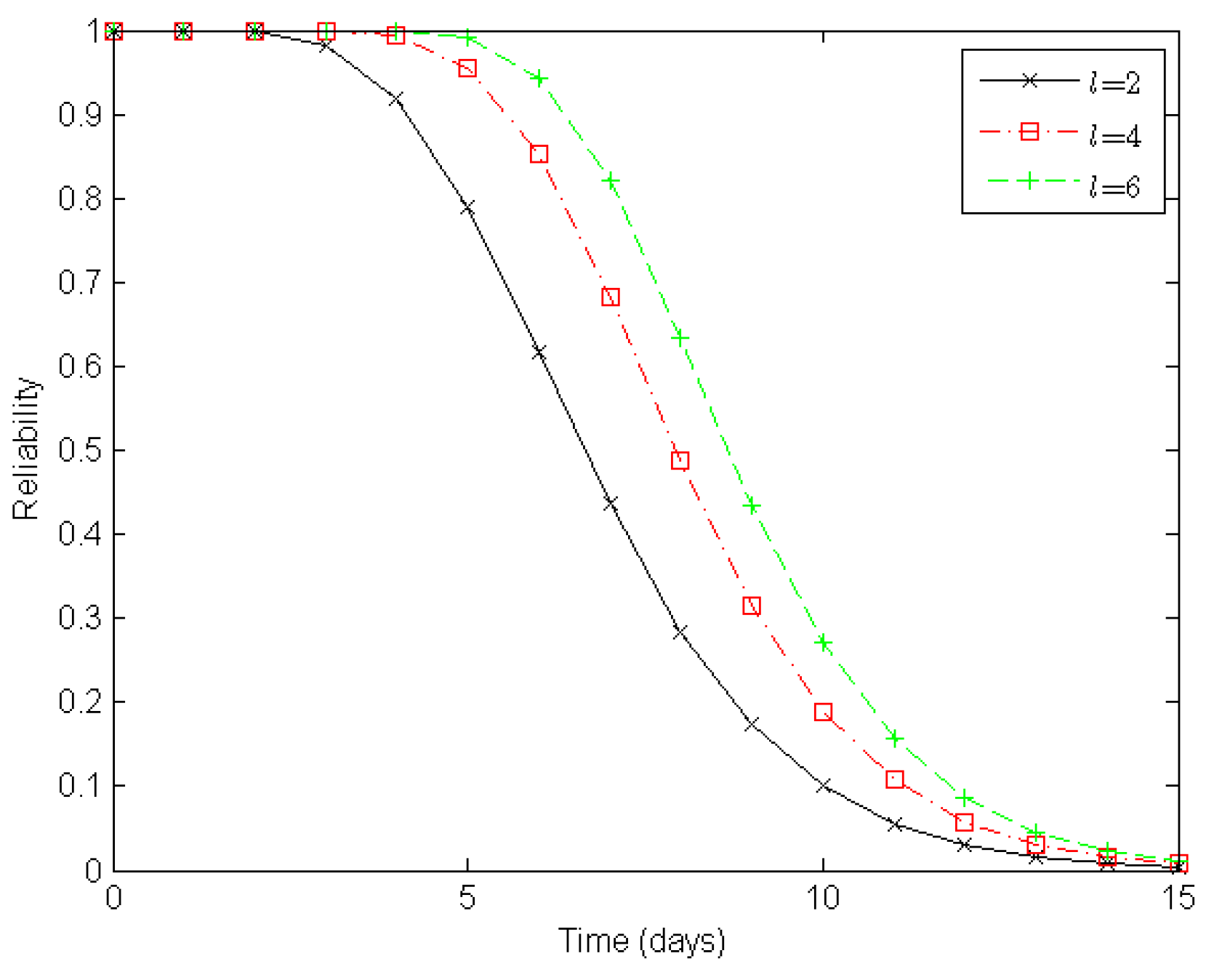 Figure 6 illustrates varying degrees of reliability for a clustered WSN when there are two, four, and six sensor nodes in a cluster, respectively. When both the number of clusters in a route and the number of routes in a clustered WSN are static, the reliability of the WSN increases with the number of sensor nodes in a cluster. With two, four, and six nodes in a cluster, it takes about six, nine, and eleven days, respectively, to reduce the reliability of a clustered WSN to 0.5 under the epidemic-malware propagation scenario.