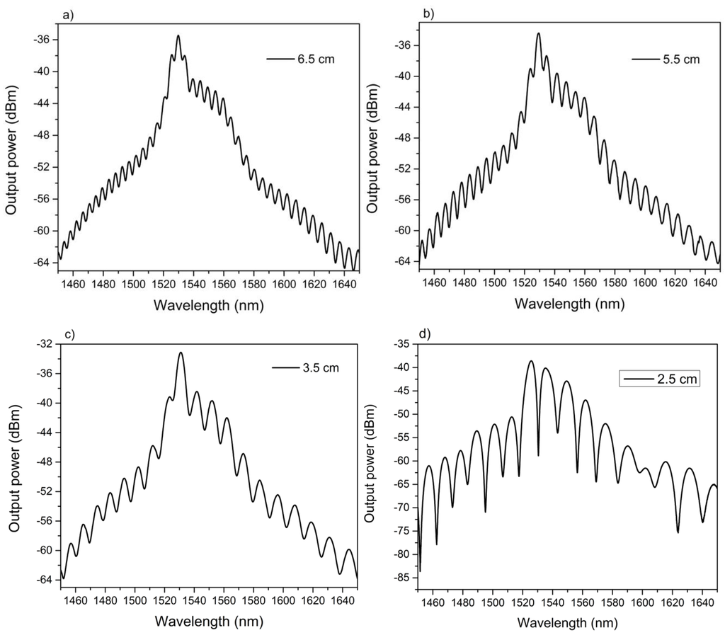 Output spectra of the MZIs with different lengths of NZ-DSF (a) L = 6.5 cm; (b) L = 5.5 cm; (c) L = 3.5 cm; (d) L = 2.5 cm.