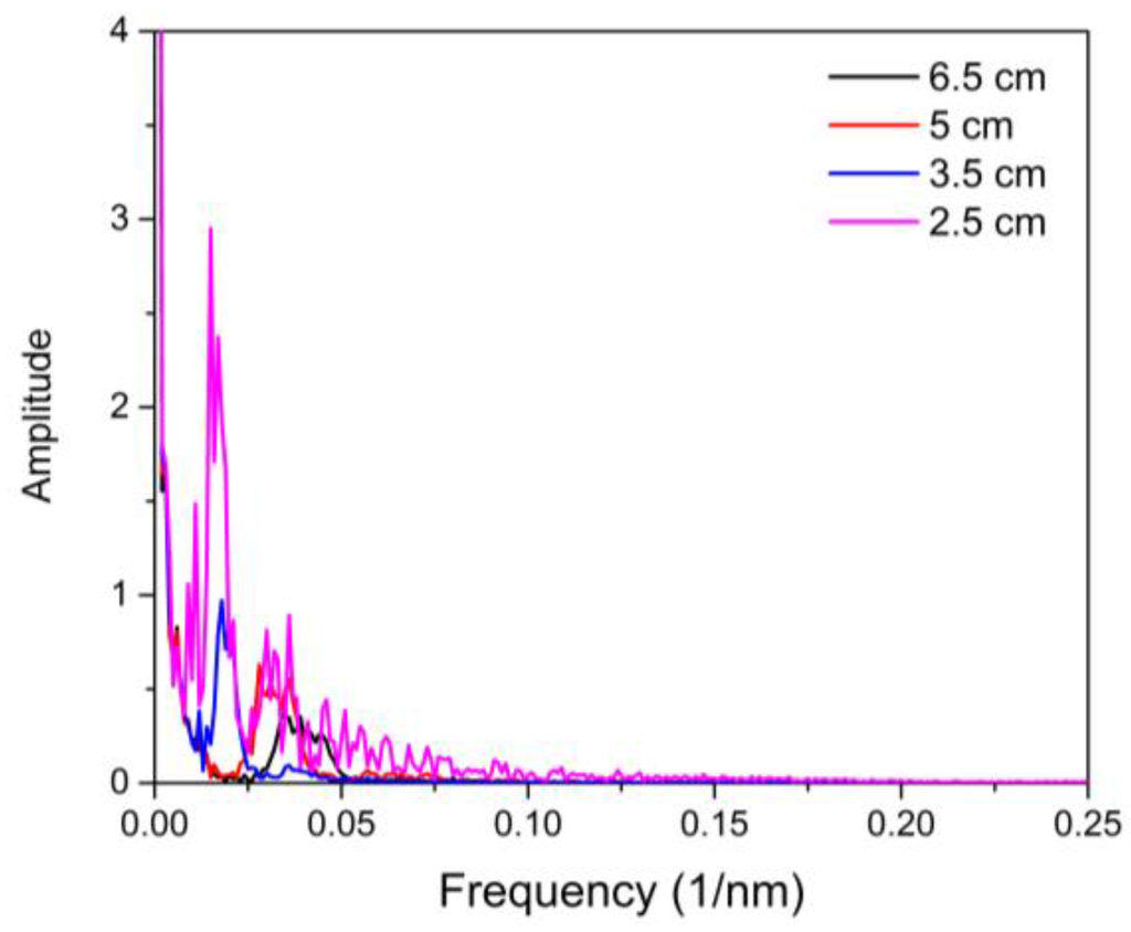 In order to determine the cladding modes and ring core modes that construct the interference spectrum, the fast Fourier transform (FFT) of the wavelength spectra is performed as is shown in Figure 6. It is found that the spatial frequency of the MZIs with lengths of L = 6.5, 5.5 and 3.5 cm, have only one dominant peak amplitude and they are located at 0.04104 0.03221 and 0.0175 1/nm. Furthermore, for the interferometer with length of 2.5 cm, the spatial frequency shows two values of spatial frequency localized at 0.0144 and 0.03221 1/nm (See, Figure 6). Thus, we believe these two frequencies are the dominant cladding mode and dominant ring core mode. Hence, the spectrum patterns will be produced by the coupling between the fundamental mode, ring core mode and high order cladding mode. However, it can be appreciated that the amplitude of the frequency localized at 0.03221 1/nm, is much smaller than the other frequency. In this way, as mentioned above the contribution of the ring core mode is small when the fringe interference is produced. The insertion losses varied among devices with a typical value about of 4 dB.