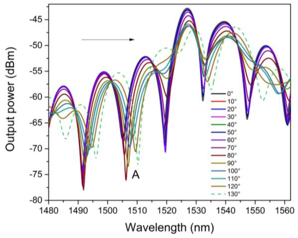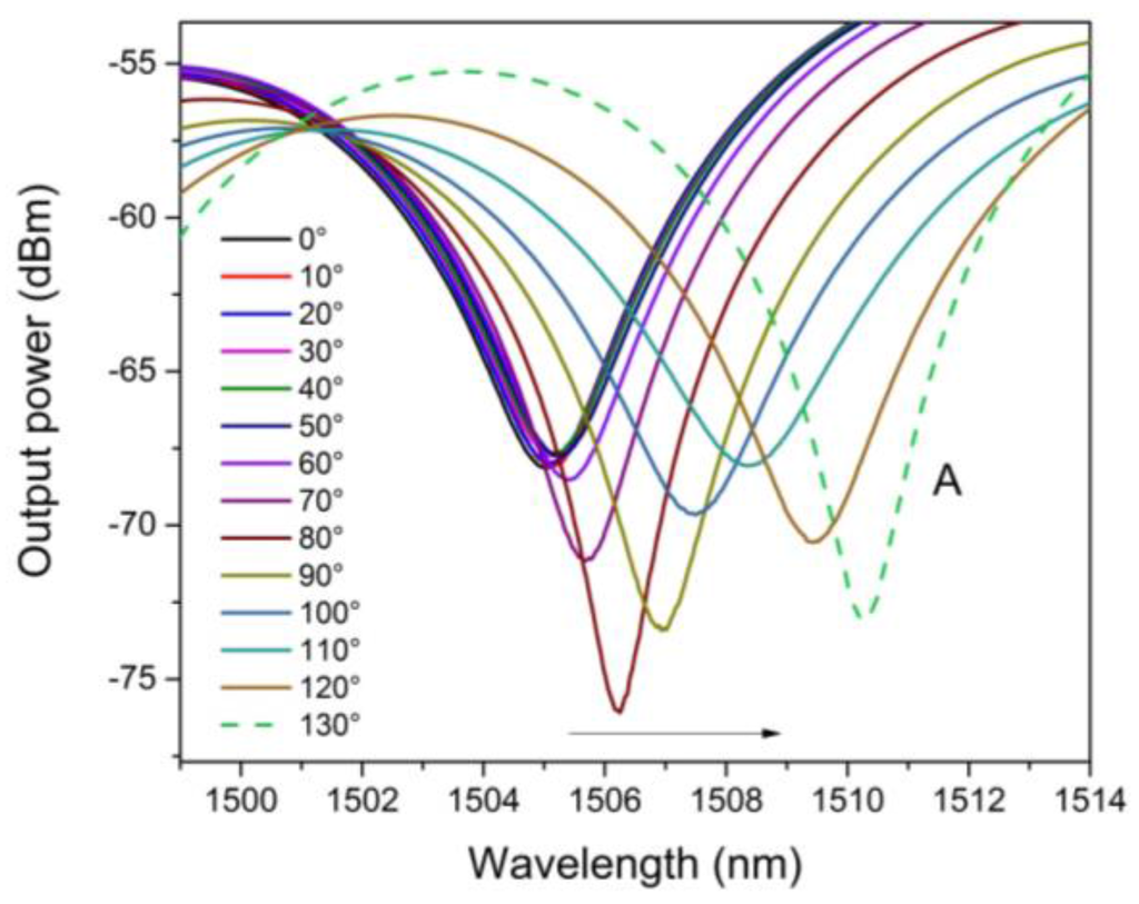 A MZI with length of 2.5 cm was tested as a torsion sensor. Here, the MZI was mounted over a fiber rotator stage (Thorlabs, model HFR007) to apply the torsion effect (See, Figure 4). In this way, the MZI was twisted in a clockwise direction from 0° to 130° with steps of 10°. In Figure 7, the spectral shifting of the MZI, can be observed, under different torsion angles. Moreover, in order to determine the spectral changing, measurement of a called A dip was done which is centered wavelength at 1504 nm (See, Figure 8). Here, it can be appreciated that the wavelength of this dip was shifted from 1504 to 1511 nm, corresponding to a total wavelength shift of about 10 nm. Hence, this spectral shift is produced due to the photoelastic effect induced by the torsion applied to the MZI [33].