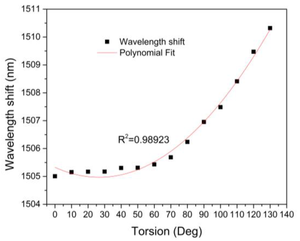 Therefore, the change of the effective refractive index both for the core and ring core thickness are small, which means a growth on the effective refractive index of cladding. In this way, modifying the torsion effect can change the effective refractive index difference between cladding and ring core thickness and core . In Figure 9, a dip (at 1504 nm) in behavior is seen, which shows a nonlinear relationship between the wavelength spectral shifting and the torsion applied. Because of core-offset fusion splicing, the shear stress would not be constant throughout the SMF|NZ-DSF|SMF structure, since, it depends on the length, the radius and torsion rate [30]. Moreover, as the core offset sections change abruptly the diameter through of all the MZI structure, large perturbations of shearing stress take place [35]. In this way, a nonlinear shearing stress is obtained due the difference between the two diameters (core-offset sections) [35]. As a result, the torsion effect is not uniform along the circumferential direction of the MZI (See, Figure 9). Hence, the maximum sensitivity of our sensor was observed at a torsion range from 60° to 130°. Besides, in this torsion range, a quasilinear relationship can be seen between the spectral fringe and the torsion applied and also that a maximum wavelength shifting was achieved. In this way a sensitivity value of 0.070 nm/° and a values of 0.989 were reached. Here, it is important to point out that, the maximum sensitivity is almost always present in the fiber optic sensors in the higher values [28]. At this point, it is important to mention that room temperature remained constant, in order to carry out all the experimental characterizations. Finally, the MZI was kept in a straight line to avoid polarization effects during the experiment.