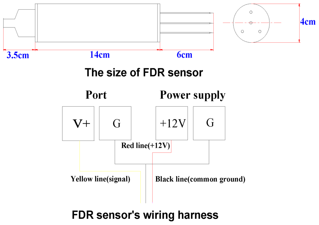 There is a specific functional relationship between the dielectric constant of the tested medium and the moisture content and temperature in the medium. Any changes in the dielectric constant are output as changes in DC voltage in the circuit through a data link, and the output data are received by a receiving terminal. The mechanism of measuring moisture content and temperature by the FDR sensor involves obtaining the dielectric constant of the soil. The moisture content and temperature can then be deduced from their calibrated relationship with the dielectric constant.