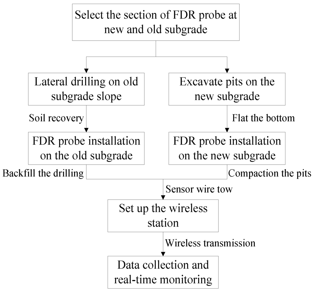 To sum up, as a technology for rapidly detecting the soil temperature and moisture content, FDR sensors have widely been used in agriculture, but studies on their application in civil engineering, especially in highway subgrade construction, reconstruction and extension are rarely found. In this paper, based on the testing principle of FDR sensors, extensive laboratory calibrations for soils were carried out first using FDR and then we present an application of FDR sensors in subgrade widening (including the old and newly-filled subgrades) and a new installation method for FDR sensor probes is proposed. A small weather station and GPRS wireless data transmission system were established in the field, and the real-time temperature and moisture content data monitored by FDR sensors are compared with the subgrade soil data obtained through numerical calculation to demonstrate the good real-time monitoring effect of FDR sensors, thus widening their application scope and providing reference values for other similar projects in the civil engineering field.