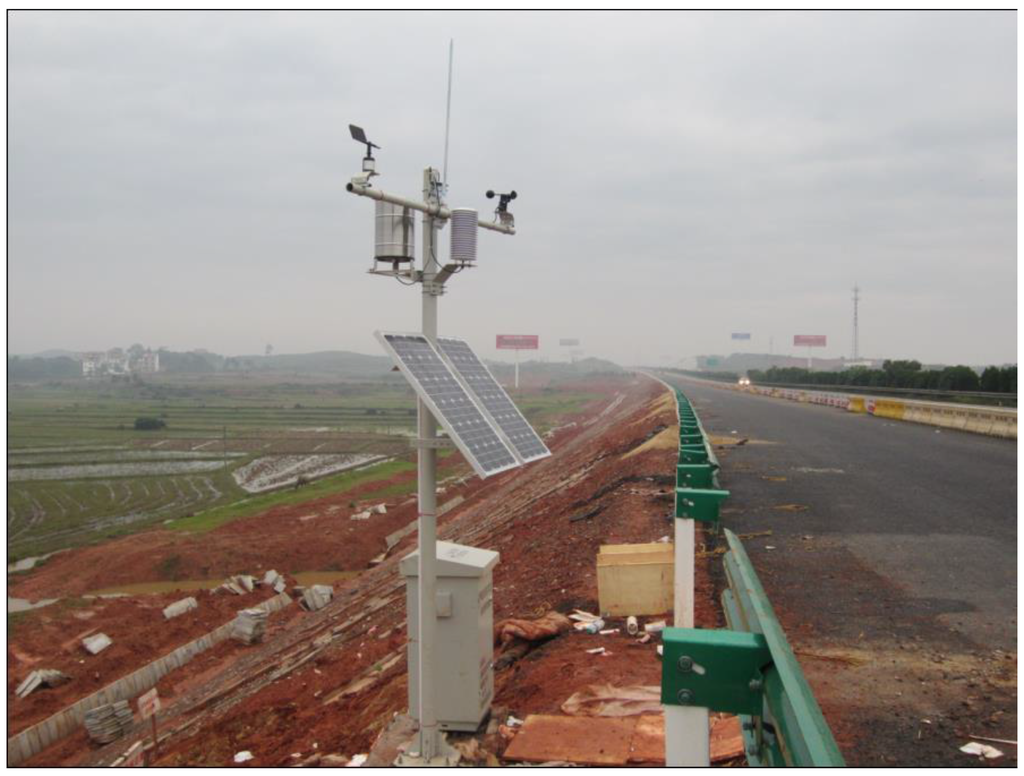 After the new subgrade is filled, the wire of the FDR sensor should be led to the top of the subgrade slope with great care and be protected effectively to prevent damages (the wire is embedded at a depth about 20 cm below the surface of the subgrade slope). To monitor the changes in moisture content and temperature of the soil mass inside the subgrade and changes in temperature and moisture surrounding the subgrade in real-time, for this study, a small weather station is installed on the upper position of the side slope, with the support bar of the station placed in concrete in the substrate (Figure 4). On the support bar, an air moisture sensor, a rain sensor, a wind speed sensor, a wind direction sensor and a lightning rod are installed; on the side of the support bar, a meter box is installed, inside which is an FDR sensor data acquisition unit, a meteorological parameter data acquisition unit, a battery and a GPRS wireless transmission module, etc., which enables real-time data to be monitored remotely. The acquisition unit acquires data every two hours and stores it in the GPRS module. Through the software installed in the computer that is compatible with the GPRS module, data stored in the GPRS module can be checked or received remotely at any time.