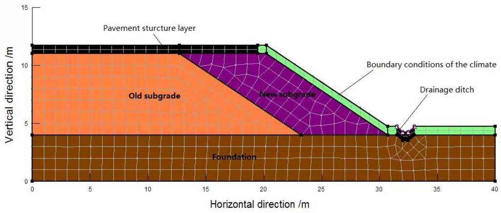 Numerical calculation model for the temperature and moisture of old and new subgrades.