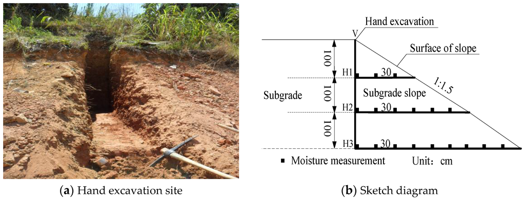 In order to verify the numerical calculation, calibration is conducted through numerical calculation and field measurement values. The calibration is carried out by the following method: before the construction of the support structure, hand excavation is conducted on the subgrade slope of the existing road. The hand excavation will be carried out along the vertical excavation line (as shown in Figure 6a), V plane is the vertical plane and the planes H1, H2 and H3 are set at a distance of 1.0, 2.0 and 3.0 m, respectively, from the top of the subgrade (as shown in Figure 6b). A moisture content test (by the oven-drying method) will be conducted at the interval of 30 cm on plane H in the excavation to acquire the field measurement data of moisture content at each point.