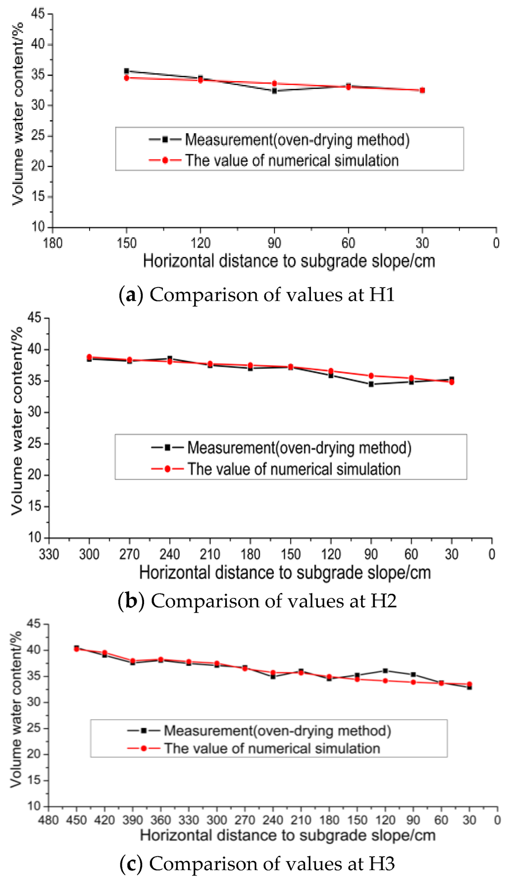 Figure 7 shows that when the horizontal distance between the measuring point in the subgrade and the surface of the subgrade slope is larger than 150 cm, the computed value is close to that measured value and their average differences on planes H2 and H3 are 0.86% and 1.11%, and although due to the influence of the climate conditions, the measured values vary more significantly at the location with a level distance less than 1.5 m from subgrade slope, the average difference between the calculated and measured values on H1, H2 and H3 is 1.69%. Therefore, the results of numerical simulation agree well with those of the field measurements. The above calibration proves the validity of the numerical calculation method selected in the paper.