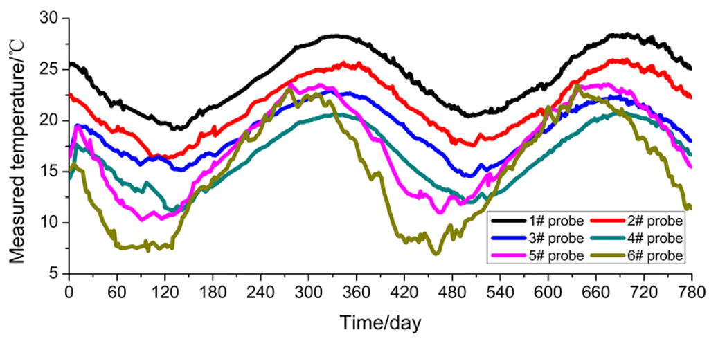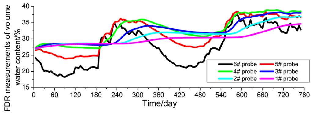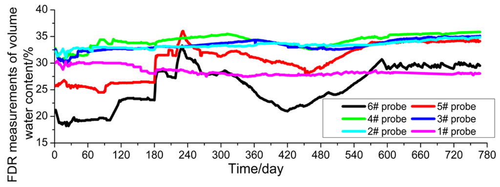 The FDR sensors acquire data once every 2 h and take the average value of the daily monitoring data to make a plot as shown in Figure 5. In this study, the monitoring duration is from 10 November 2013 to 16 December 2015, spanning two test cycles. For plotting convenience, the data when the monitoring started (i.e., 10 November 2013) is taken as the first day. In Figure 8, it can be observed that the temperatures at the measuring points are mainly within the range of 8 °C–28 °C. They show a gradual rising tendency from February to August and a gradual declining tendency from August to the following February, and reach their peak and trough in August and February, respectively, showing that the temperature change is highly consistent with the natural environment conditions. The temperature values measured by the embedded sensors (#5 and #6) close to the outer side of the subgrade slope demonstrate relatively great changes, but those measured by the rest change gently. The reason is that sensors #5 and #6 are closer to the subgrade slope, so they are more influenced by the atmospheric environment.