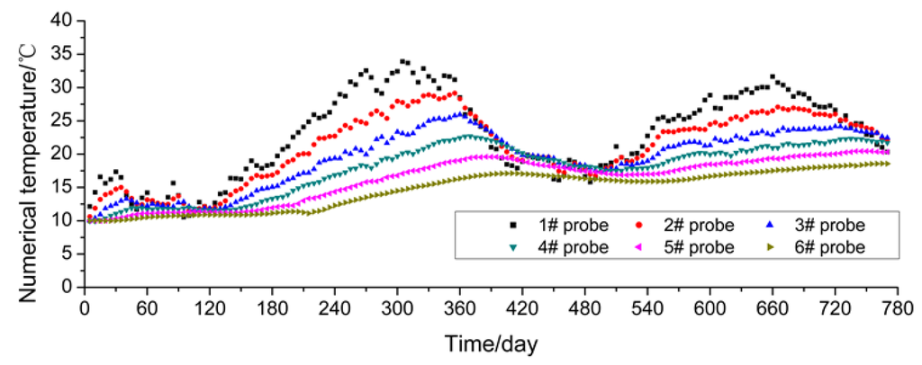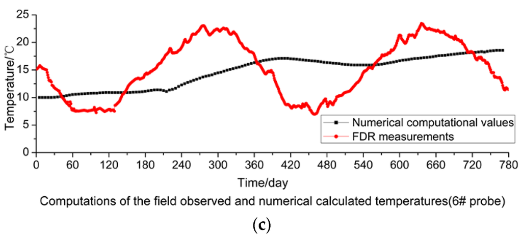 The results calculated through the numerical simulation based on the temperature values at the measuring points in the soil mass of the subgrade are plotted in Figure 10. This figure indicates that the soil mass temperature values obtained from numerical calculation show consistency with the natural climate conditions and demonstrate specific periodic changes, and that the values measured by sensors #5 and #6 close to the outer edge of the subgrade slope show a relatively large change amplitude. However, the comparison of measured values (Figure 5) shows that the minimum temperature values from numerical calculation are 16 °C–19 °C around February 2014, which is significantly different from the measured values of 7 °C–20 °C. Further analysis indicates that the reason is that for the numerical calculation it is assumed that the subgrade soil mass is uniform with even compactness and minor porosity. However, in fact, the compactness at different parts of the subgrade and the porosity of the soil mass are not uniform, so pores in the soil mass are easily connected with each other. For the reasons given above, the change amplitude of the temperature values measured by the sensors far from the subgrade slope is smaller than that of the values measured by the sensors close to the outer side of the subgrade slope, which can also be verified by the values measured by the FDR sensors.