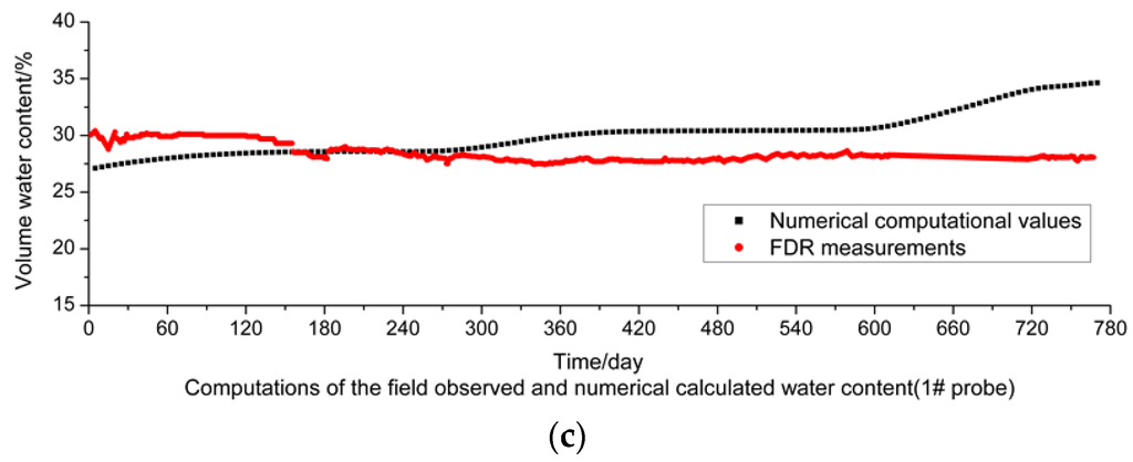 From Figure 13c, for sensor #1 embedded in the old subgrade, the measured values are substantially different from and even inconsistent with the values obtained through numerical calculation. According to deliberate analysis, the reason is that the moisture content in the old subgrade, having been subject to over a decade of operation, increases [13]; however, the newly-widened subgrade is filled under optimum moisture content conditions, so water migrates from the old subgrade to the new one, which causes a further decline of the moisture content in the old subgrade. In contrast, according to the calculated values, the moisture content in the old subgrade rises, because the moisture content values of the old and new subgrades are designed to be same when the mathematical model is established. The discrepancy shown by sensor #1 can more effectively reflect the contrast between the measured values of FDR sensors and the calculated values. In addition, the analysis on actual conditions at the field shows that measured values of FDR sensors are more consistent with the actual conditions, thus further verifying that the values measured by FDR sensors are effective.