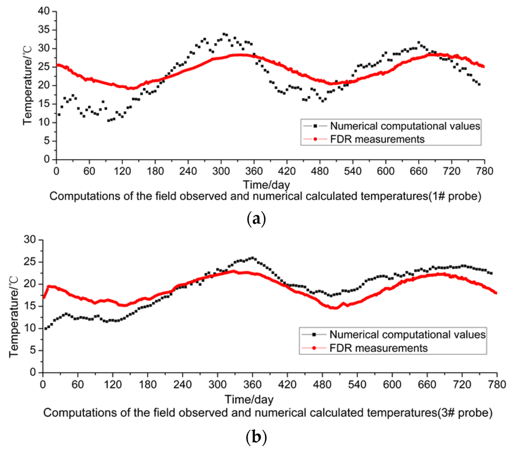 The results calculated through the numerical simulation based on the temperature values at the measuring points in the soil mass of the subgrade are plotted in Figure 10. This figure indicates that the soil mass temperature values obtained from numerical calculation show consistency with the natural climate conditions and demonstrate specific periodic changes, and that the values measured by sensors #5 and #6 close to the outer edge of the subgrade slope show a relatively large change amplitude. However, the comparison of measured values (Figure 5) shows that the minimum temperature values from numerical calculation are 16 °C–19 °C around February 2014, which is significantly different from the measured values of 7 °C–20 °C. Further analysis indicates that the reason is that for the numerical calculation it is assumed that the subgrade soil mass is uniform with even compactness and minor porosity. However, in fact, the compactness at different parts of the subgrade and the porosity of the soil mass are not uniform, so pores in the soil mass are easily connected with each other. For the reasons given above, the change amplitude of the temperature values measured by the sensors far from the subgrade slope is smaller than that of the values measured by the sensors close to the outer side of the subgrade slope, which can also be verified by the values measured by the FDR sensors.